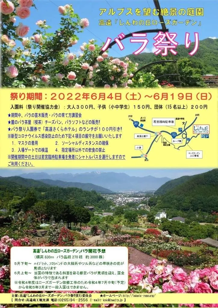 伊那市高遠町にある「高遠しんわの丘ローズガーデン」のバラ祭りが6月4日から開催されます。